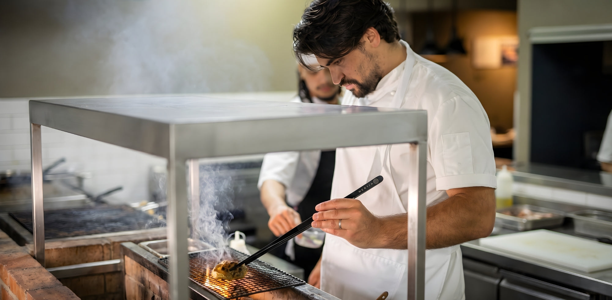 Two Chefs expertly plating a dish using Oui Chef offset tweezers